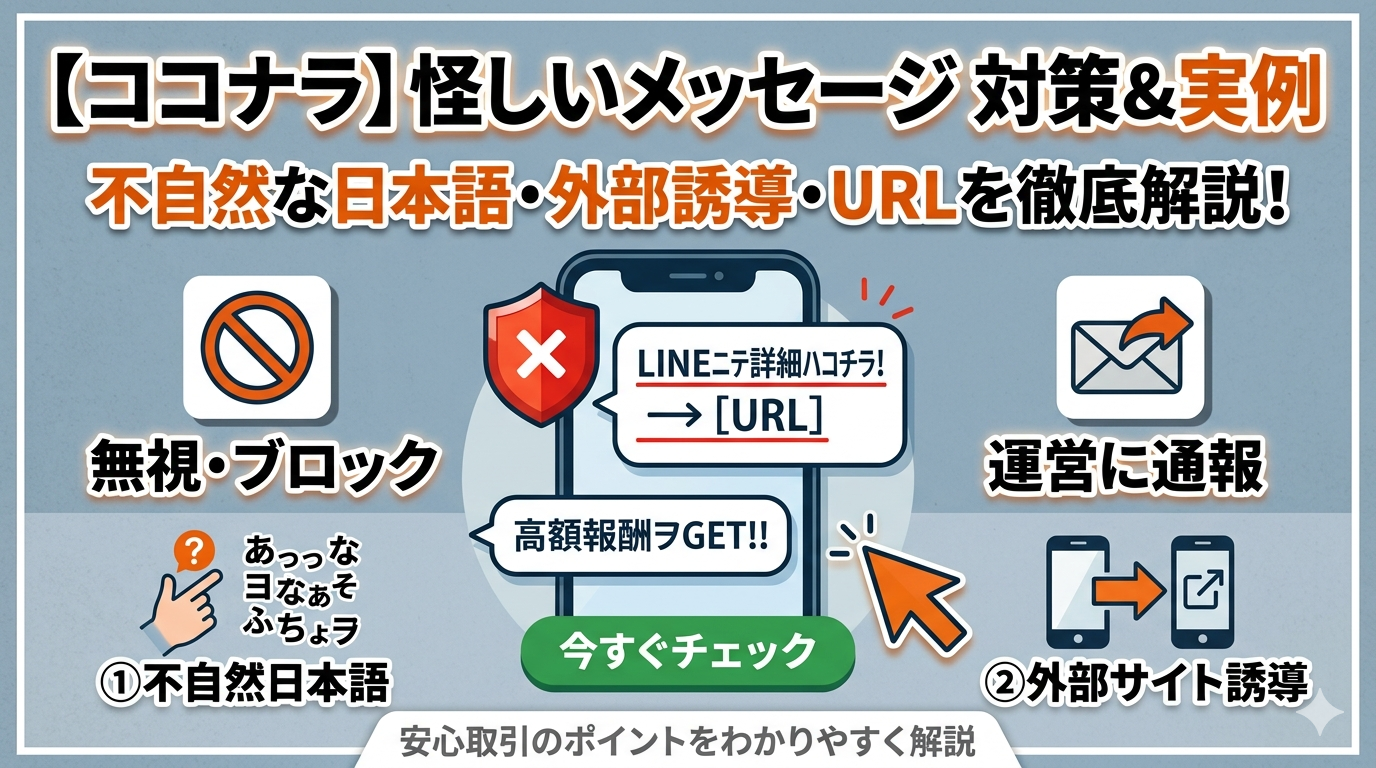 ココナラを使っていて、見知らぬ相手から突然怪しいメッセージが届いて不安になった経験はありませんか? ココナラで届く怪しいメッセージには、不自然な日本語・外部サイトへの誘導・URL添付など、いくつかの共通したパターンがあり […]