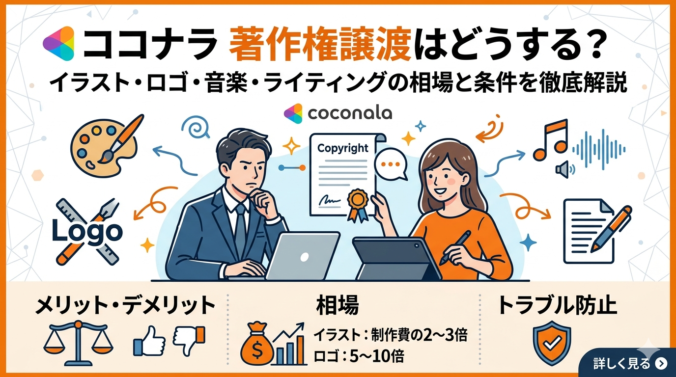 ココナラでイラストや音楽などを販売していると、「著作権譲渡ってどうすればいいの?」と悩む方も多いのではないでしょうか。 著作権譲渡はしない選択肢もありますが、相場や条件を正しく理解しておくことがトラブル防止につながります […]