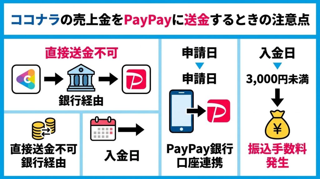 ココナラの売上金が3,000円未満の場合、振込手数料が発生するため、PayPay銀行へ送金する際にコストがかかる点に注意が必要です。