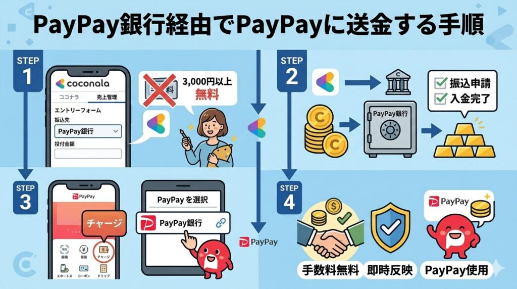 これはココナラが一定額以上の振込に手数料をかけない仕組みを採用しており、出品者が無駄な費用を負担しなくて済むよう配慮されているためです。 例えば毎月の売上が3,000円を超える場合、PayPay銀行に振り込んだ後にPayPayへ無料でチャージできるため、実質的に完全無料で資金を移動できます。