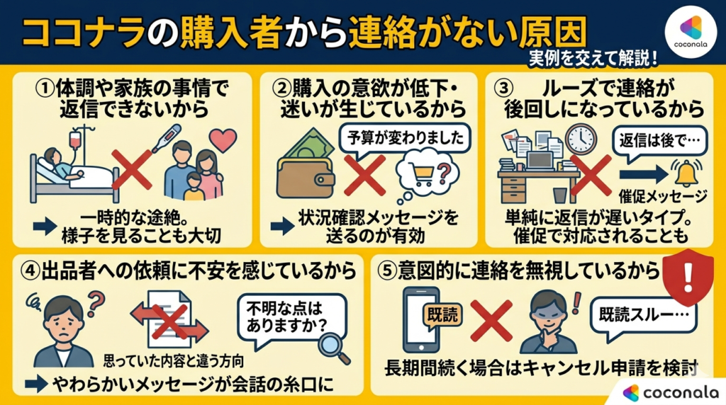 ここでは、ココナラで購入者から連絡が来なくなる代表的な原因をご紹介します。