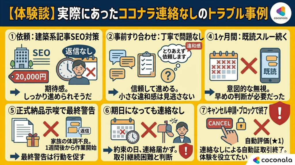 【体験談】実際にあったココナラ連絡なしのトラブル事例