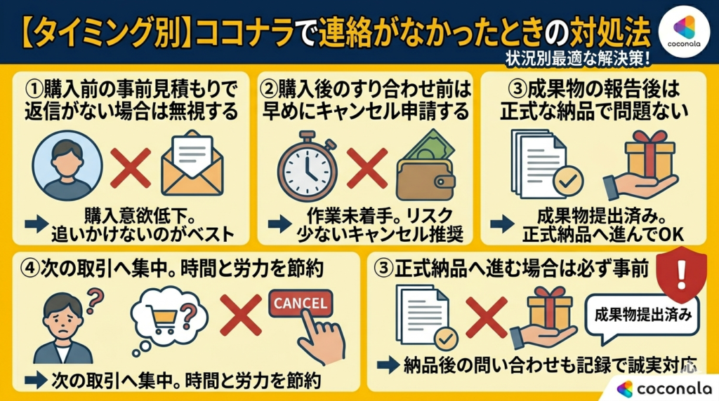 ココナラで購入者から連絡が来ない場合は、原因を見極めたうえで、タイミングに合った対処法を選ぶことがもっとも重要です。