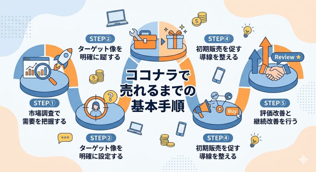 ココナラで売れるまでには、市場調査・サービス設計・改善サイクルという基本の流れを押さえることが大切です。