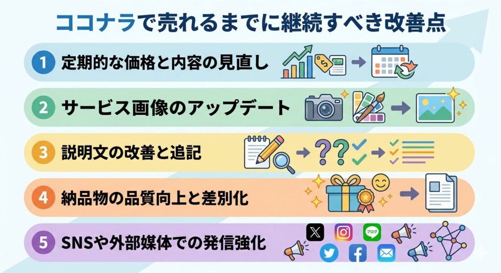 ココナラで売れるまでには、市場調査・サービス設計・継続的な改善という一連の流れをしっかりと実践することが大切です。