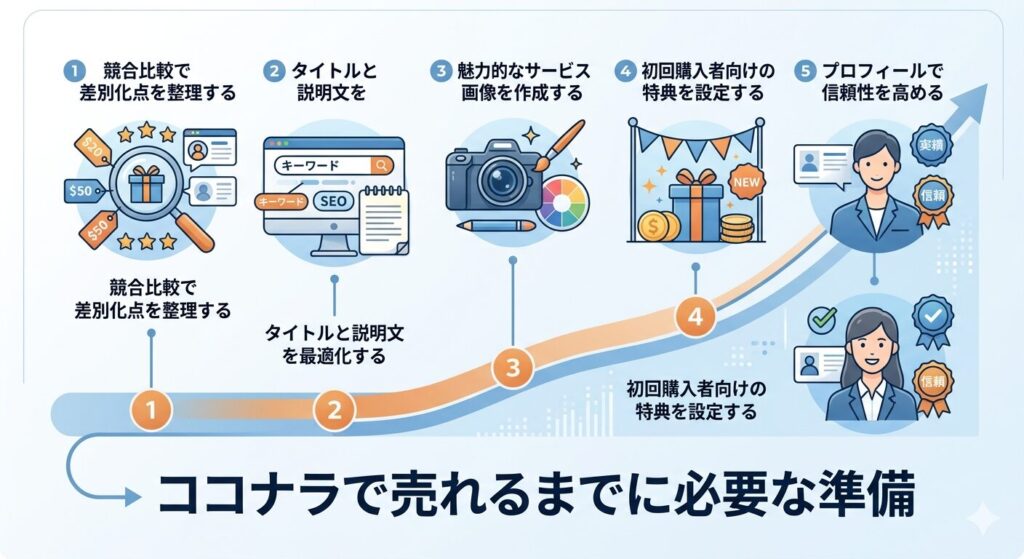 ここでは、ココナラで初めて販売を達成するために必要な5つのステップをご紹介します。 各ステップを順番に実践することで、売れるサービスへの道筋が見えてきます。