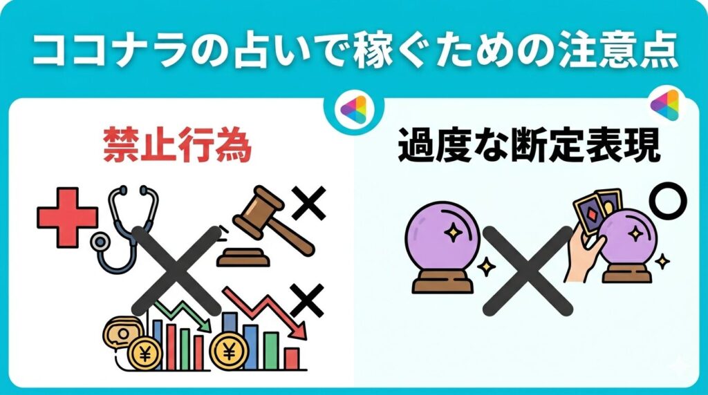 「占いの結果に基づいた株の売買を勧める」「病気の診断をする」といった行為は明確に禁止されているため注意しましょう。