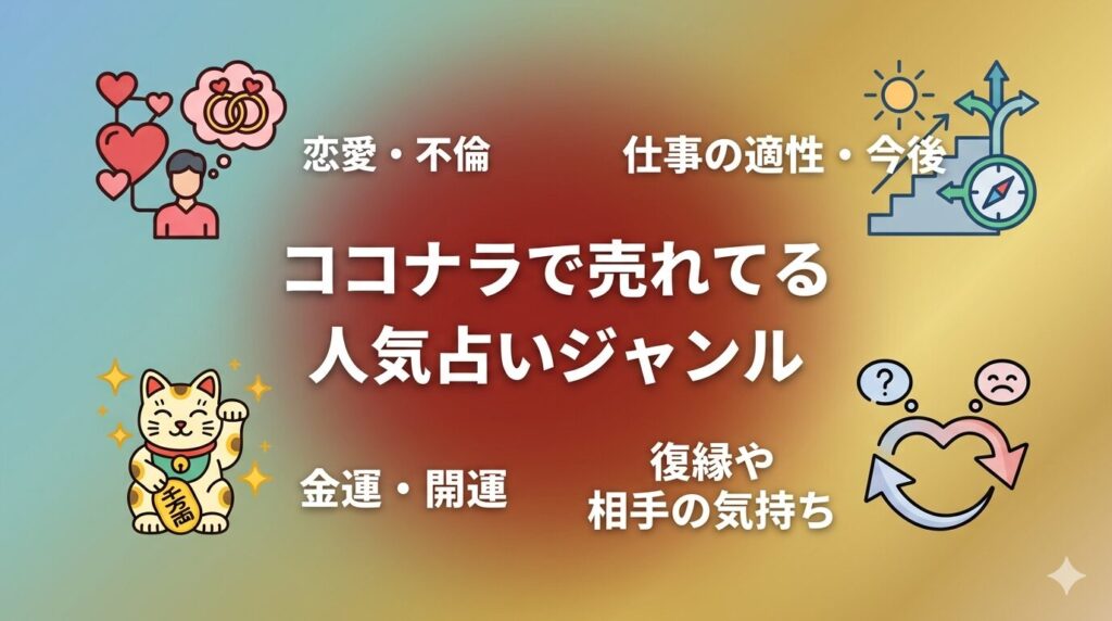 ココナラの占いカテゴリにはさまざまなジャンルがありますが、特に需要が高いテーマを押さえておくと出品戦略が立てやすくなります。