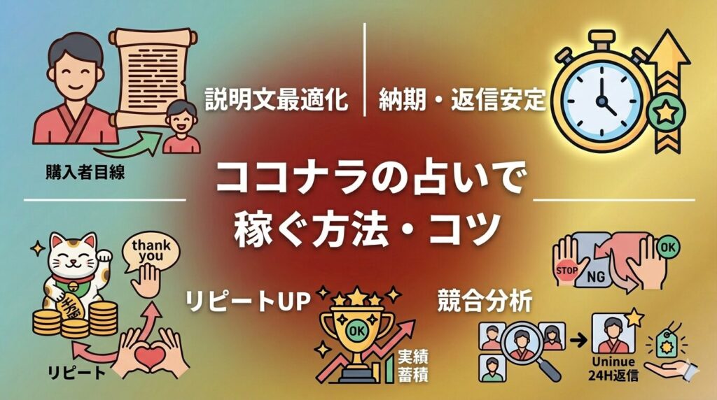 ココナラの占いで安定した収益を得るには、出品内容の工夫だけでなく継続的な改善と顧客対応が大切です。