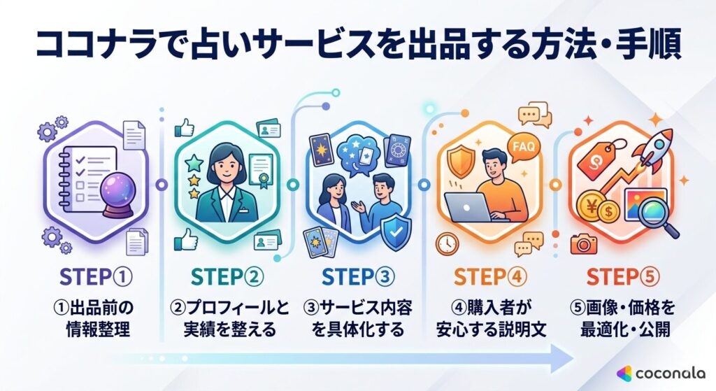 ココナラで占いサービスをスムーズに出品するために、まずは必要な手順を順番に確認しておきましょう。