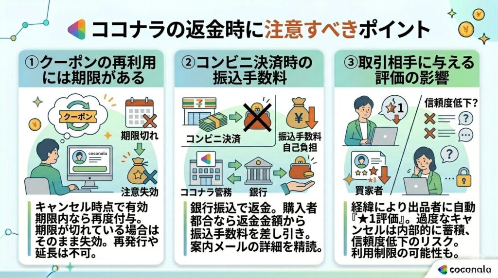 ここでは、返金時に付随するリスクや、利用者に知っておいてほしい注意点について解説します。