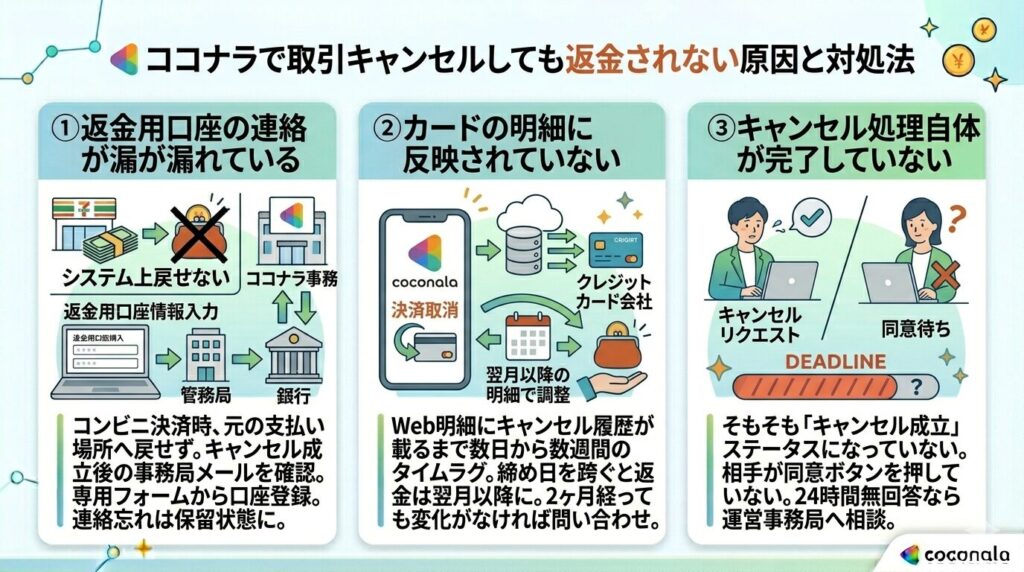 ここでは、キャンセルが成立したはずなのに返金が確認できない時の原因と解決策を説明します。