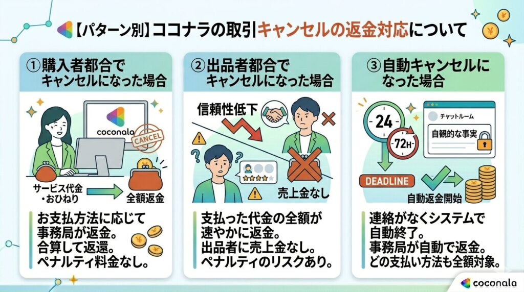 ここでは、取引がキャンセルになった際の返金ルールをパターン別に詳しくご紹介します。