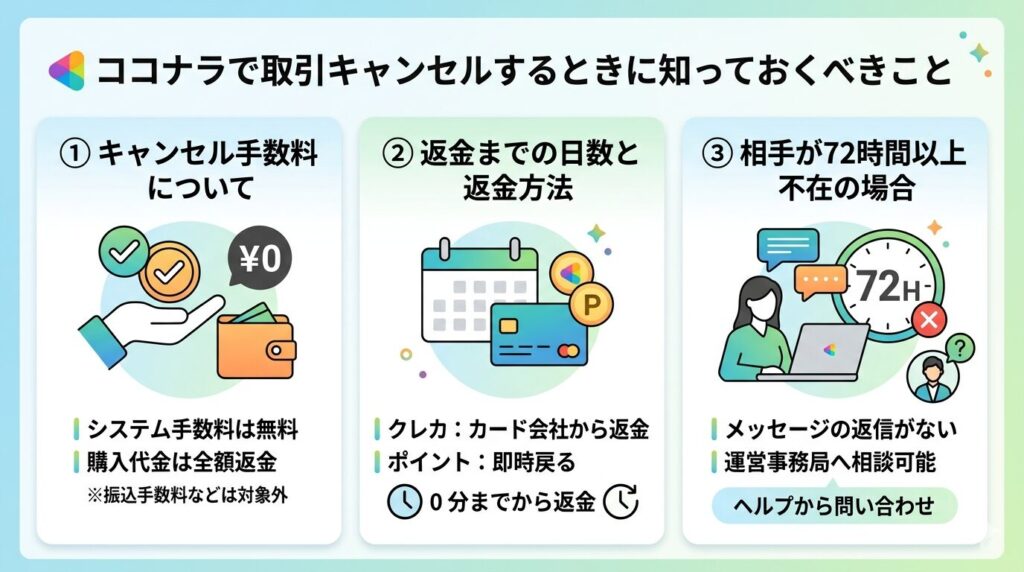ここでは、キャンセルに伴うお金の動きや音信不通時の対応など、ユーザーが不安に感じやすい点について解説します。 損をしないためにも、手数料や返金方法の仕組みを正しく理解しておきましょう。