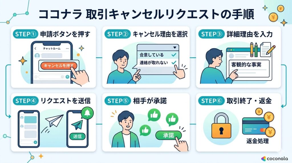 ここでは、ココナラのトークルームからキャンセルリクエストを送る具体的な手順について解説します。 初めての方でもスムーズに操作ができるよう、6つのステップに分けて詳しくご紹介します。