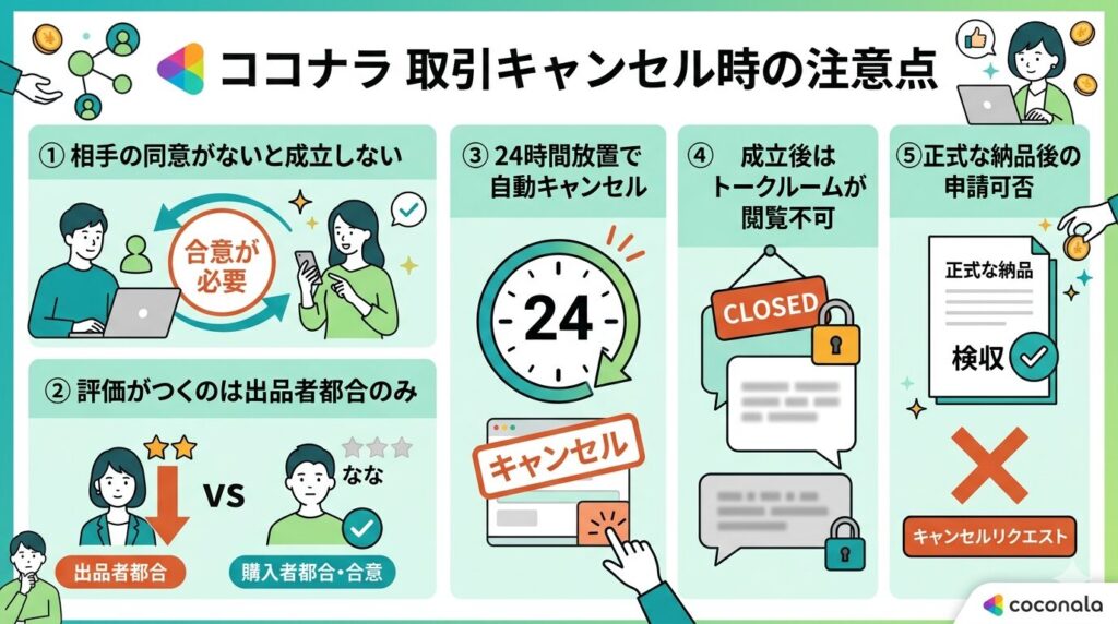 ココナラの取引キャンセルの手順はシンプルですが、返金や評価への影響など事前に確認しておくべきポイントがいくつか存在します。