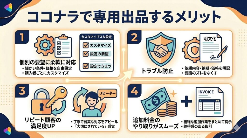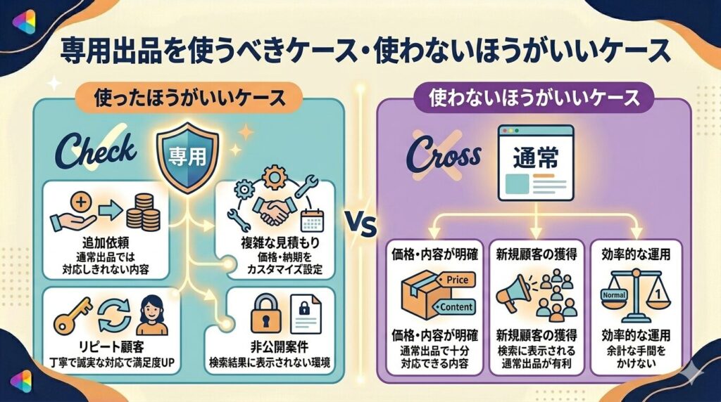 追加依頼・複雑な見積もり・リピート顧客への対応・非公開で進めたい案件などは、専用出品がとても向いているケースです。