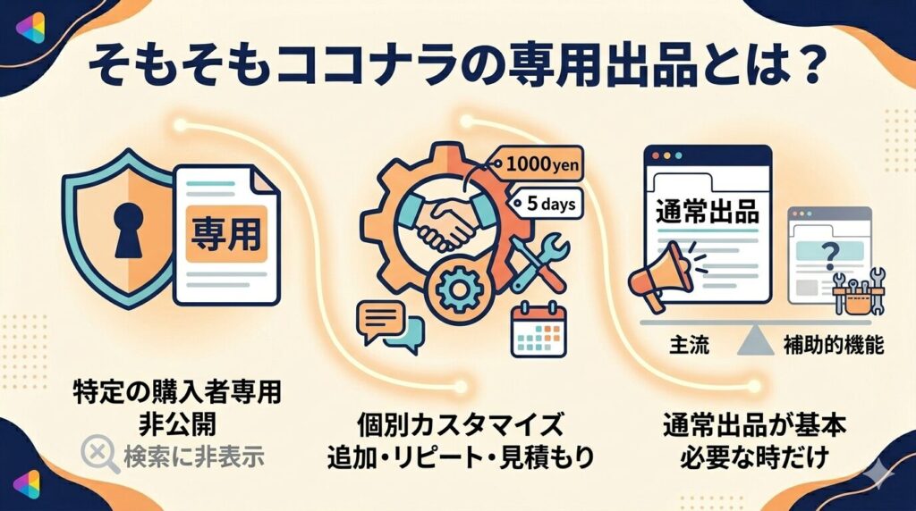 ココナラの専用出品は、個別対応・追加依頼・リピート対応・非公開案件など、通常出品では対応しづらい場面で非常に役立つ機能です。