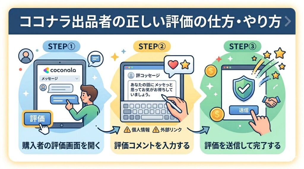 評価コメントは、丁寧かつ簡潔に、実際の取引内容をもとにした事実ベースの内容で書くことが望ましいとされています。なお、個人情報の記載や外部サービスへの誘導はココナラの利用規約で禁止されているため、注意しましょう。
