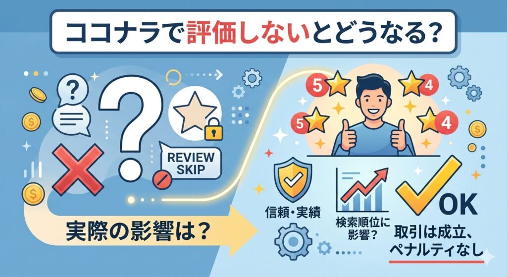 一方で、評価の積み重ねは実績の可視化や購入者からの信頼獲得につながる重要な要素であり、評価しないことで取引完了が遅れたりリピート率に影響が出たりする可能性もあります。
