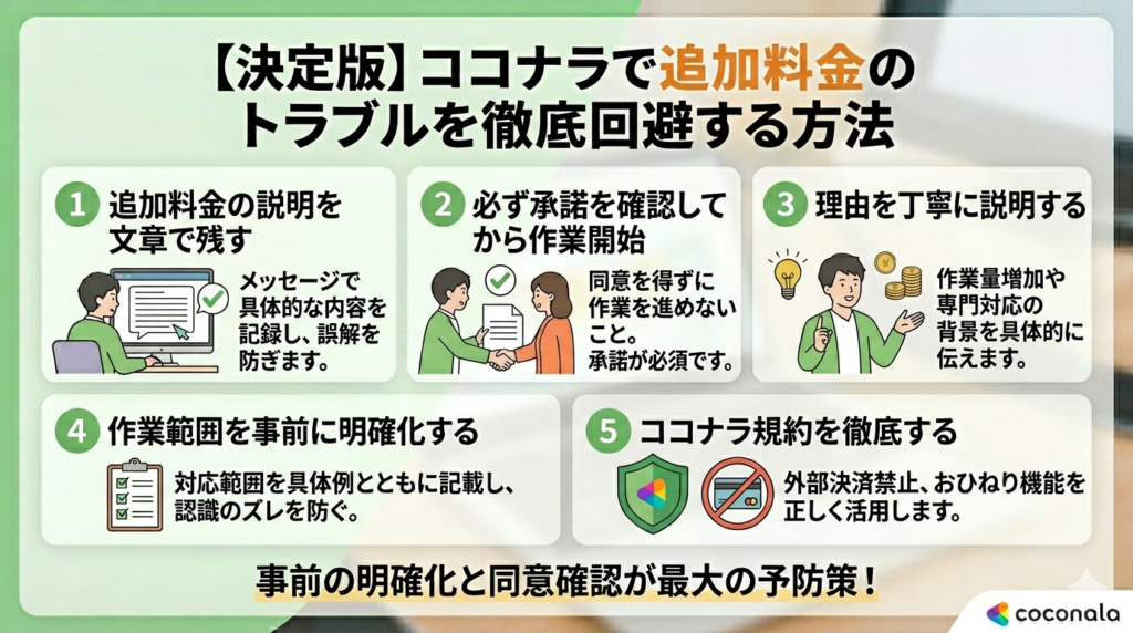 ここでは、追加料金に関するトラブルを未然に防ぐための具体的な方法を紹介します。日頃から丁寧なやり取りを心がけることが、信頼関係を築くうえでとても大切です。