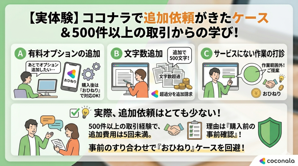 私がココナラで行った500件以上の取引経験の中で、実際に追加費用が発生したケースは5回にも満たないほど少ないのが実情です。