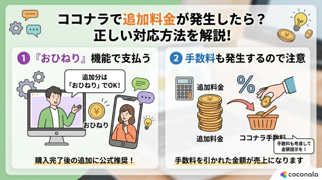 ここでは、ココナラで追加料金が発生したときの正しい対応方法について解説します。追加料金の仕組みを理解しておくことで、スムーズにやり取りを進めることができます。