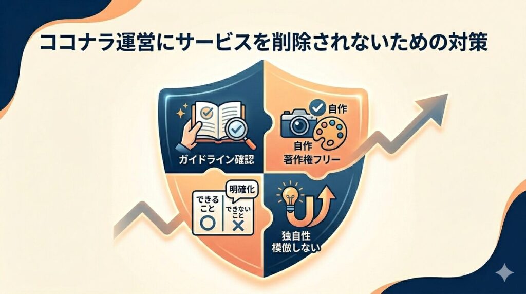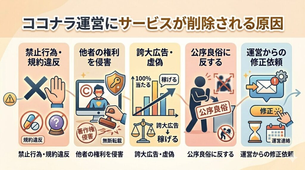 ココナラでサービスが削除される原因は規約違反や誇大表現・権利侵害などが主なものであり、事前にガイドラインを確認しておくことが最大の対策です。