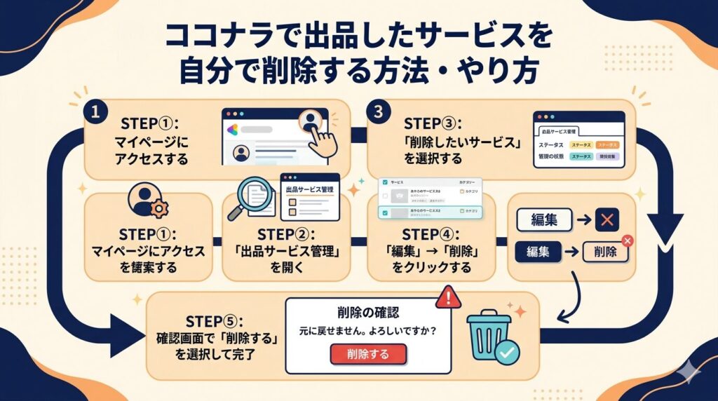 ココナラで出品したサービスが削除された?原因と対策、自分で削除する方法を解説