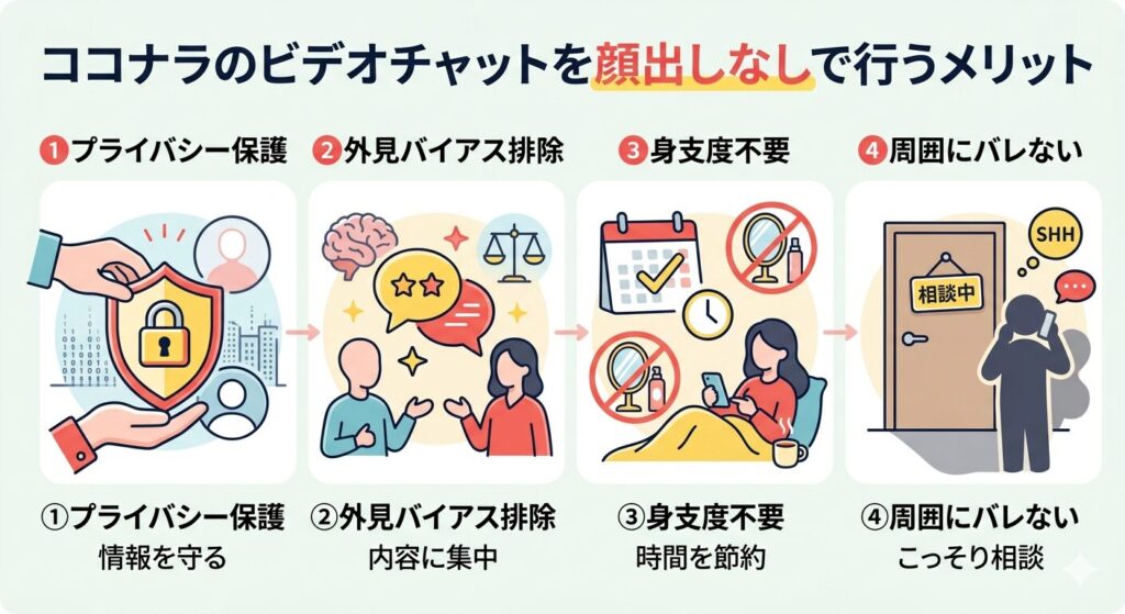 特に急ぎの相談や隙間時間を活用したい場合に、顔出し不要のスタイルは大きな利点となります。