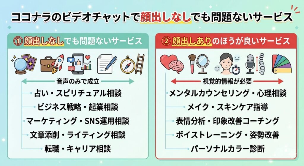 ココナラのビデオチャットは、顔出しなしでもサービスの種類や工夫次第で十分に活用できます。