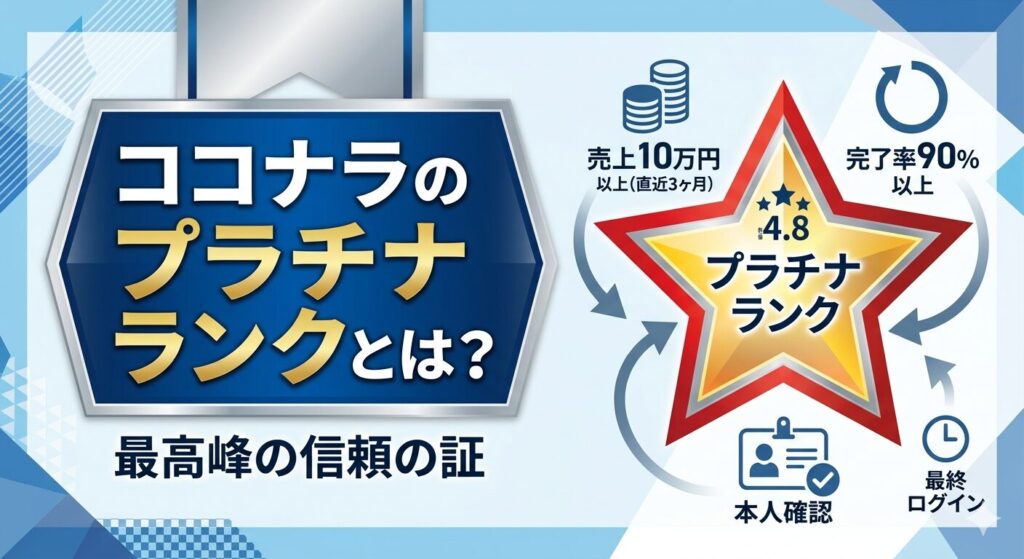 ココナラのプラチナランクとは、売上・評価・完了率などの条件をすべて満たした出品者に与えられる最上位ランクです。