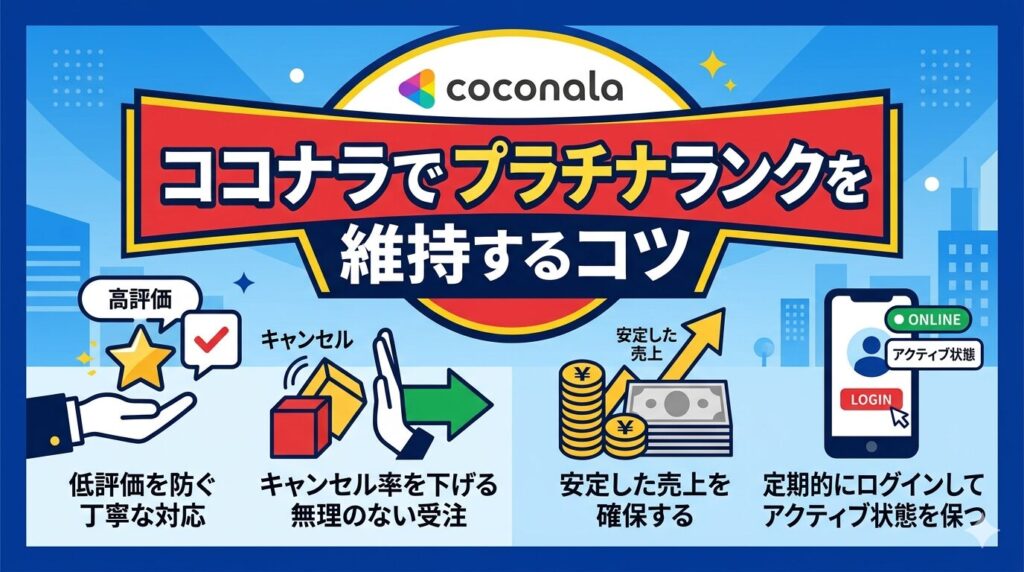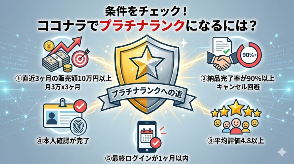 プラチナランクの維持には、直近3ヶ月の販売額10万円以上・納品完了率90%以上・平均評価4.8以上・本人確認の完了・最終ログイン1ヶ月以内の5つの条件をすべて満たし続ける必要があります。