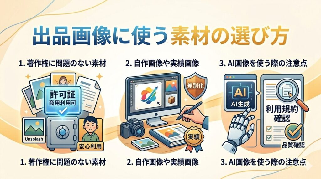 ここでは、出品画像に使用する素材を選ぶ際に気をつけたいポイントについてご紹介します。