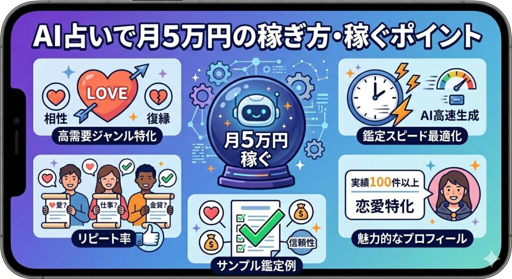 AI占いを活用して月5万円を達成するために、実践的な稼ぎ方のポイントを具体的に解説します。