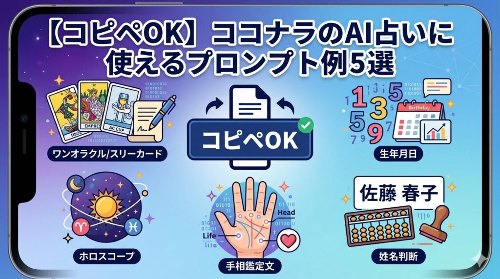 ココナラのAI占いに使えるプロンプト例を5つ紹介します。