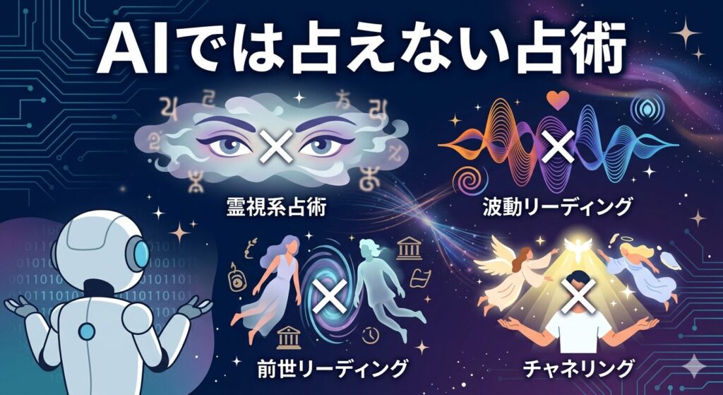 「あなたの前世はどこの国の何者だったか」という問いに対して、AIが根拠のある答えを出すことは構造上できません。前世リーディングはAI占いの対象外として正直にお客様へ伝えることが、信頼構築においても重要です。