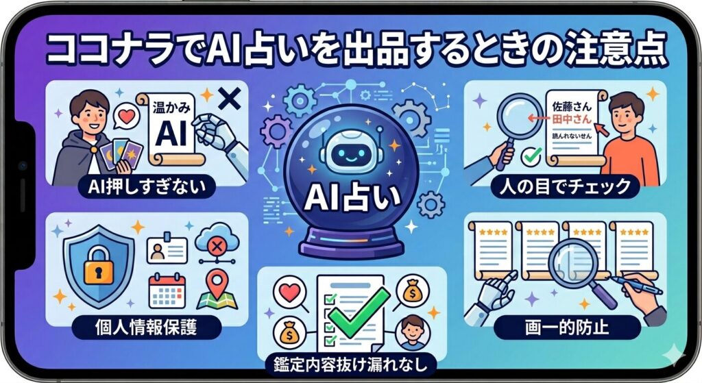 AI占いを出品する際には、品質やお客様との信頼関係を守るために意識すべき注意点があります。