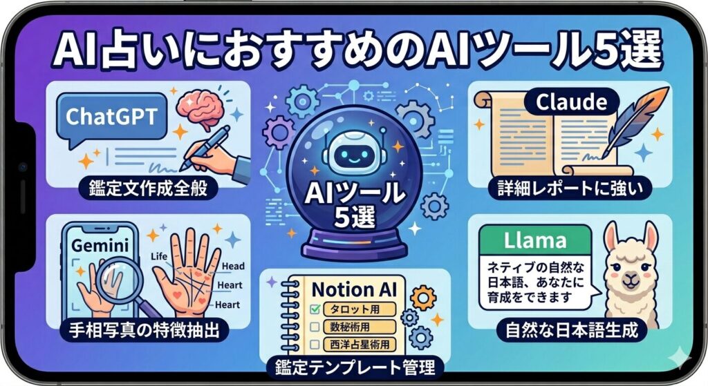 AI占いを効率よく行うために、鑑定文作成に役立つおすすめのAIツールを5つ厳選して特徴とともに紹介します。