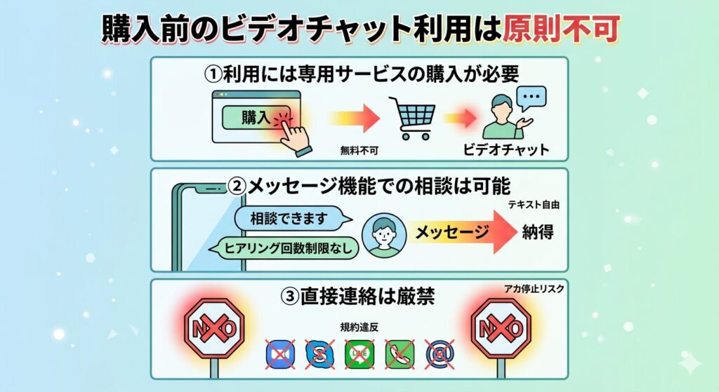 そのため、事前にビデオチャットで相談したい場合は、相談専用の少額サービスを購入する必要があります。