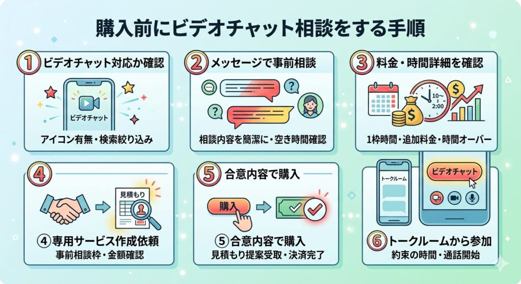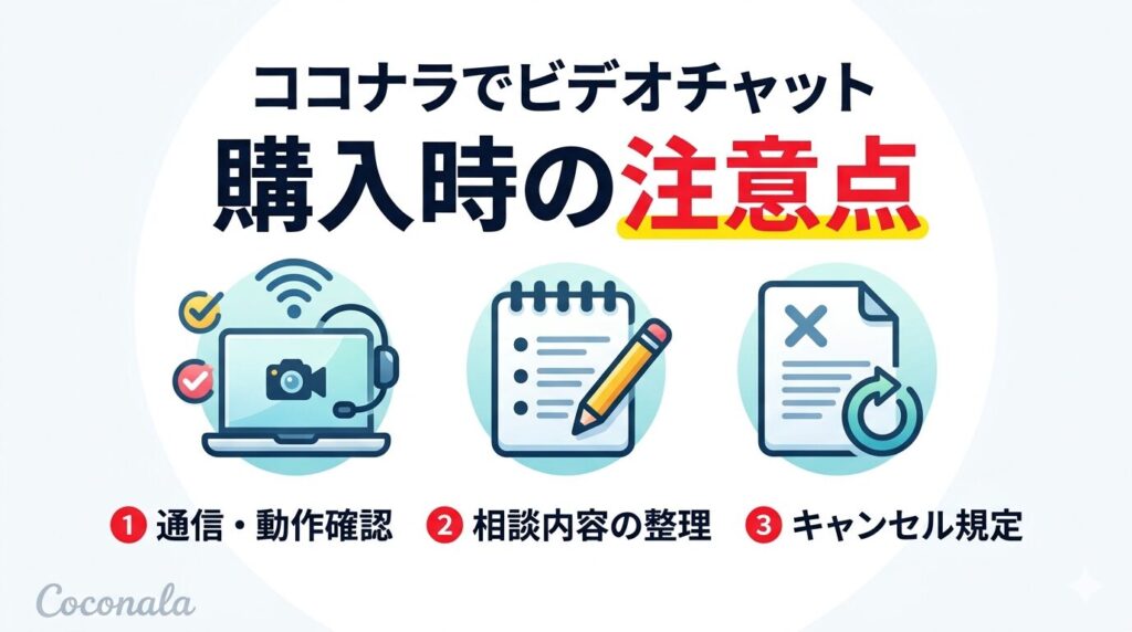 ビデオチャット1枠あたりの時間設定や延長時の追加料金、上限時間超過時の対応ルールを事前に確認し、相談内容が設定時間内に収まるかを出品者とすり合わせておくことで、思わぬ追加費用の発生を防げます。