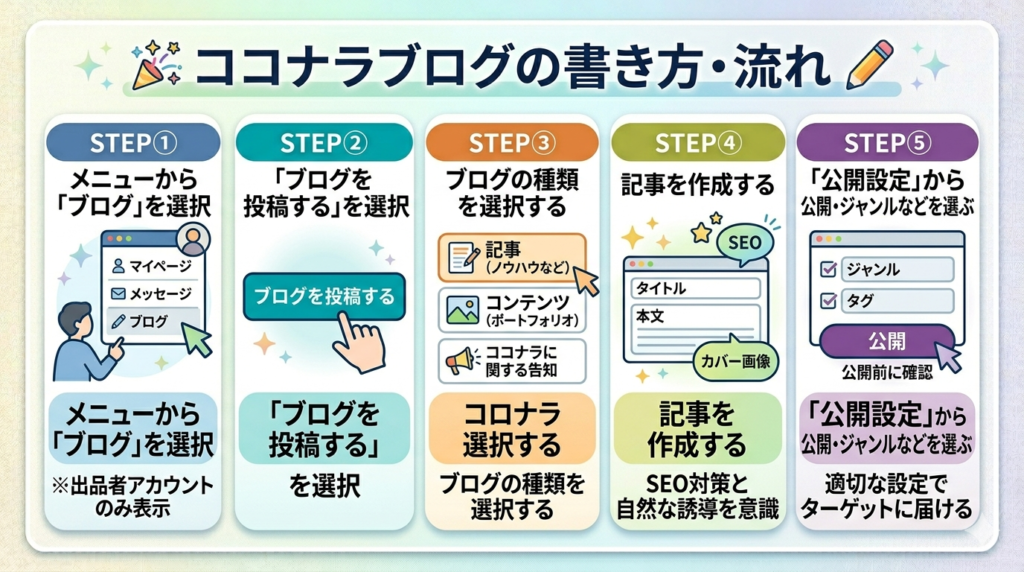 この記事では、ココナラブログのメリットや注意点から、具体的な書き方・実践ポイントまでを初心者にもわかりやすく解説していきます。