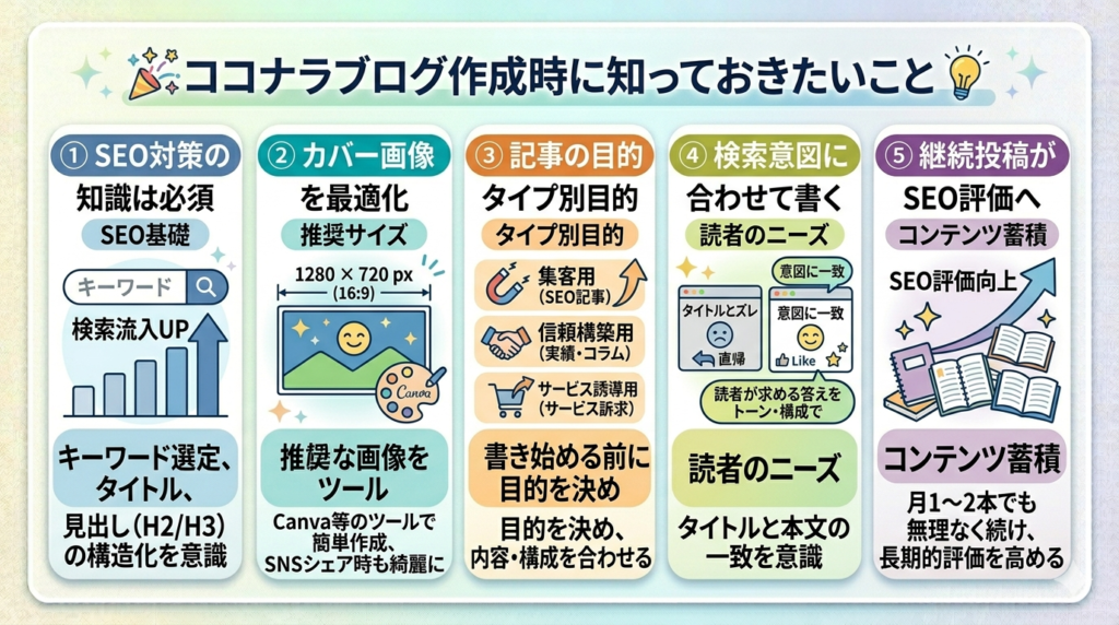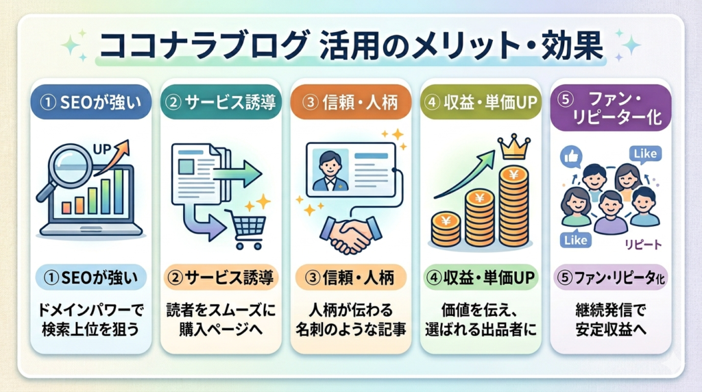 主なメリットは「SEO流入」「サービス誘導」「人柄の発信」「収益・単価の向上」であり、注意点としては「スマホ非対応」「外部誘導不可」「テーマがココナラ関連に限られる」点を理解したうえで活用することが大切です。
