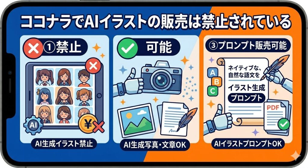 ココナラの公式規約ではAIイラストの販売が明確に禁止されており、出品した場合はサービス削除やアカウント停止などの対応が取られることがあります。