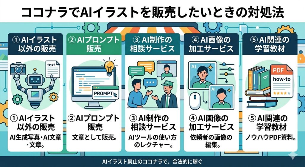 AIイラストは禁止されていますが、AI技術を活かして合法的に稼げる選択肢がいくつかあるため、代替手段を検討することをおすすめします。